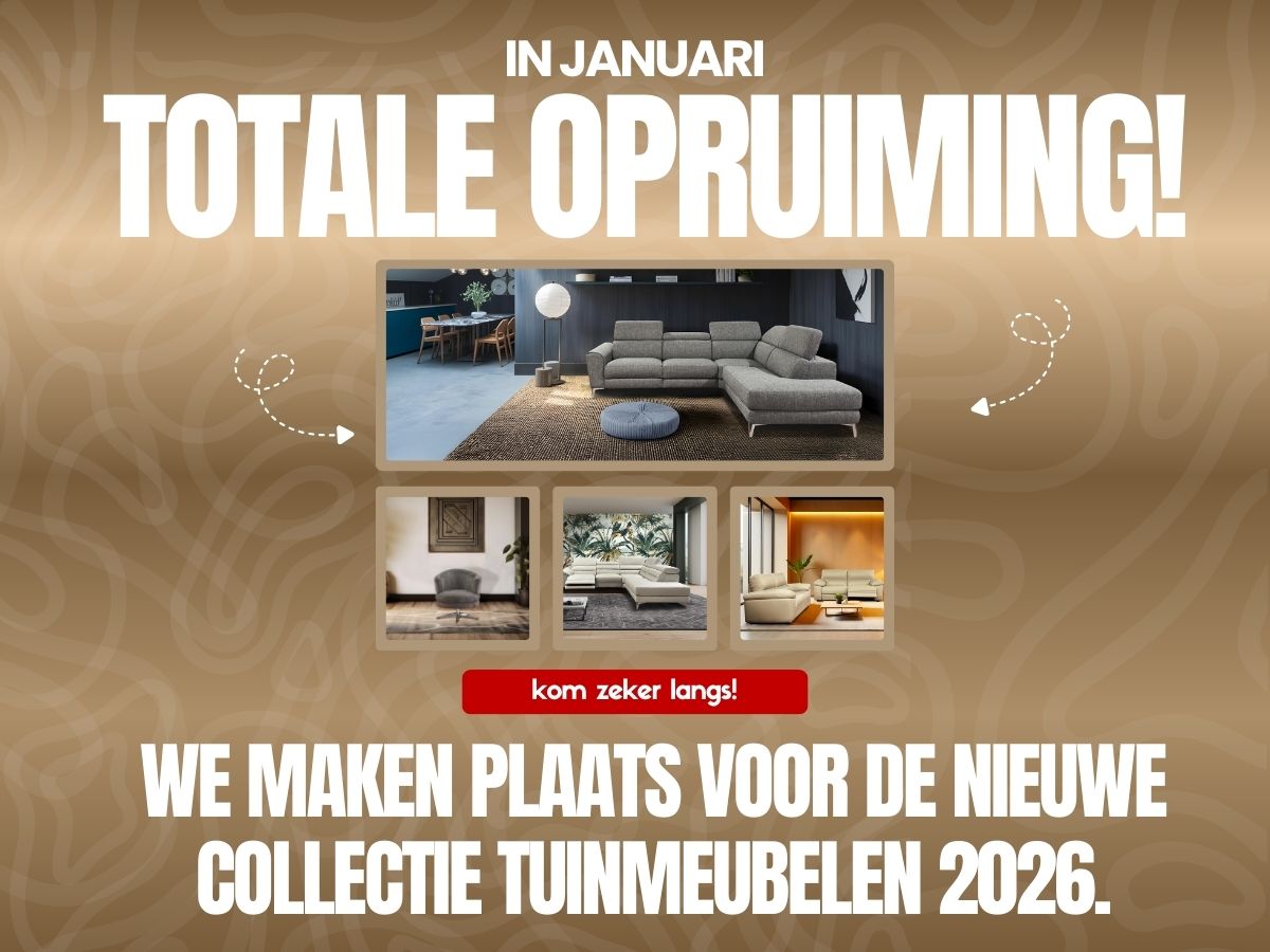Januari = totale opruiming van binnenmeubelen! We maken plaats voor de nieuwe collectie tuinmeubelen 2026.