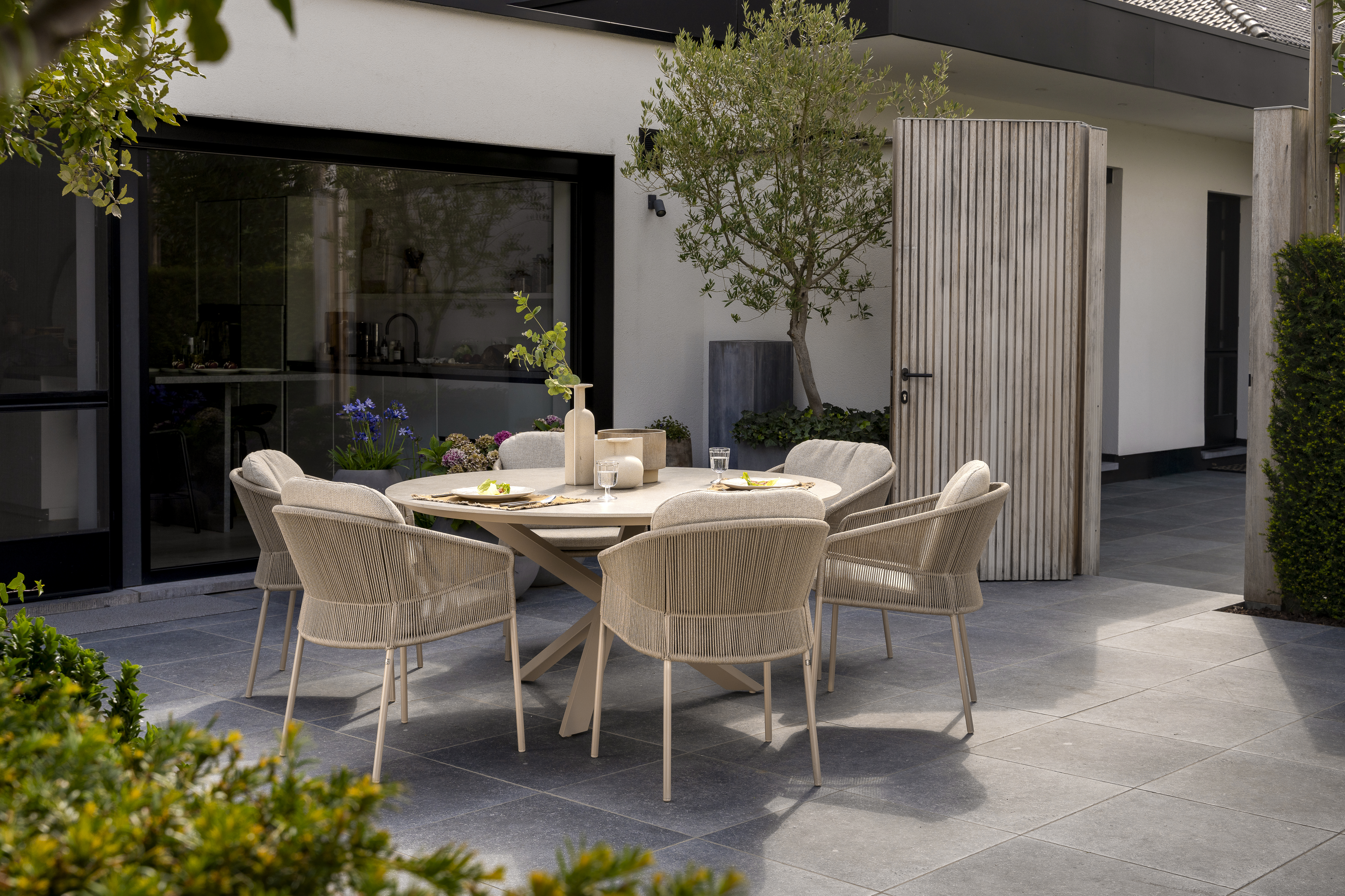Het slanke frame, uitgevoerd in latte of terre, is hoogwaardig afgewerkt en volledig weerbestendig. Tijdloos, stijlvol en perfect in balans.